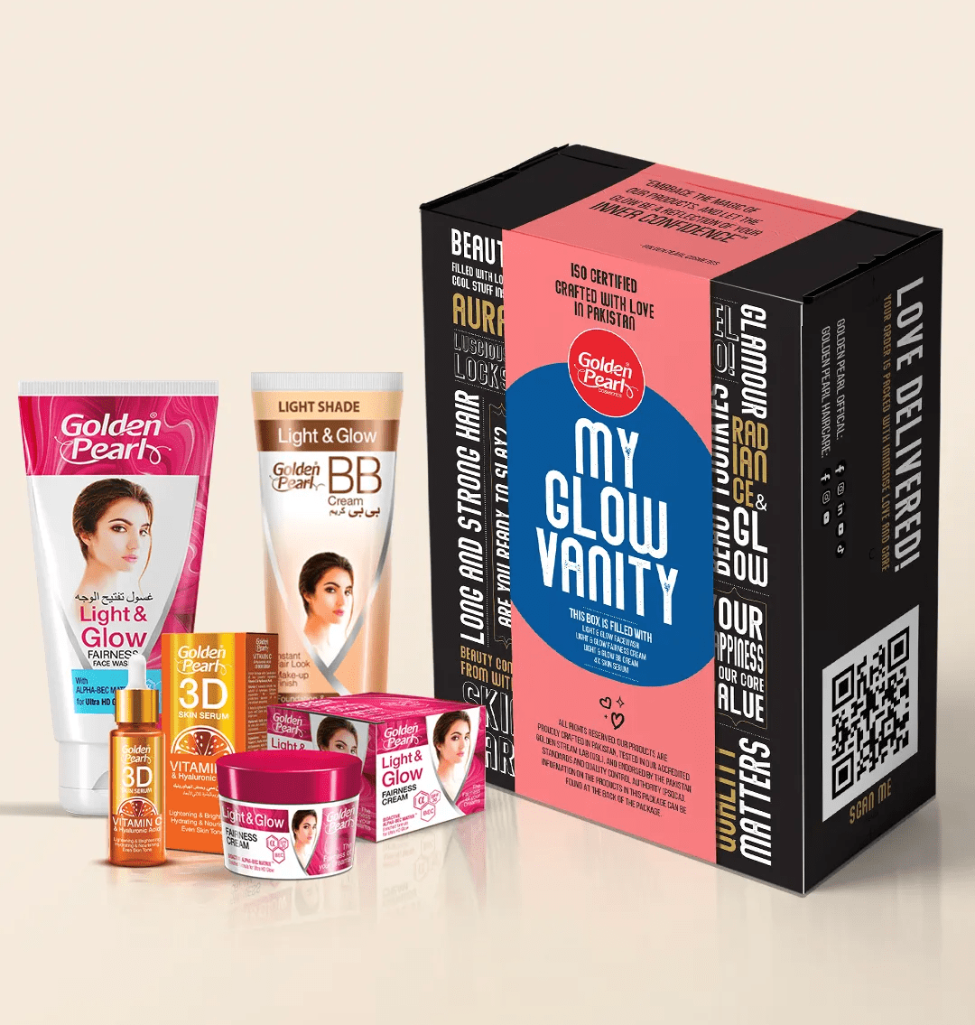 Achieve salon-like glow at home with Golden Pearl My Glow Vanity Deal   a complete skincare combo that brightens, hydrates, and rejuvenates your skin. Available at Gardezi Mart.