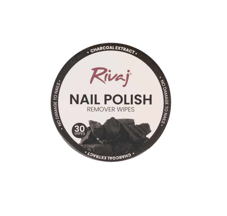 Rivaj Charcoal Nail Polish Remover Wipes deeply cleanse, detoxify, and remove nail color without acetone. Enriched with Vitamin E and natural oils  available at Gardezi Mart.